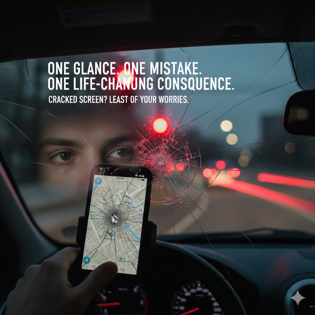 A cracked screen is the least of your worries. In that split second of distraction, you could miss a red light, drift into another lane, or fail to react in time. Accidents don’t happen because people are reckless — they happen because of moments like this. One glance. One mistake. One life-changing consequence.